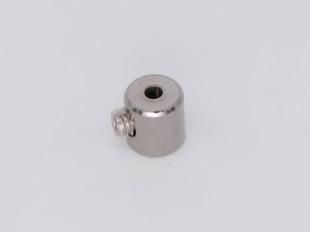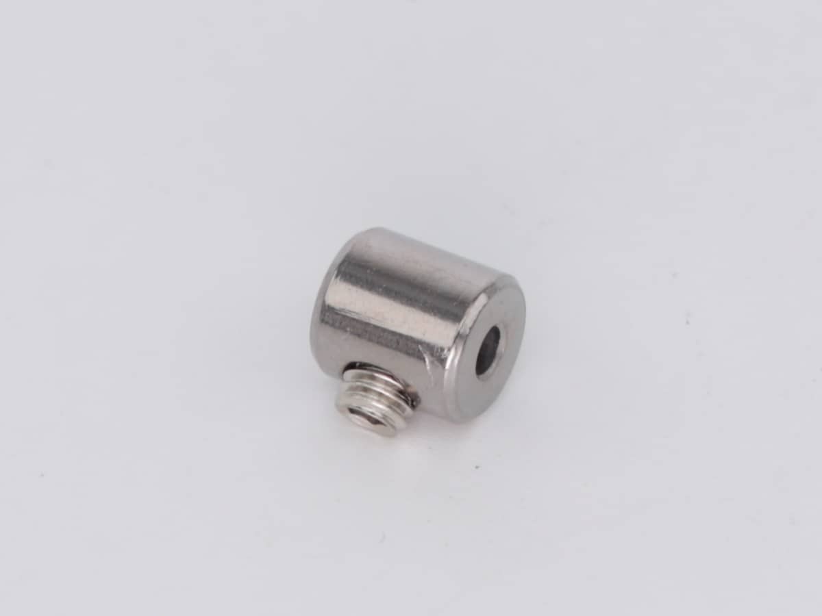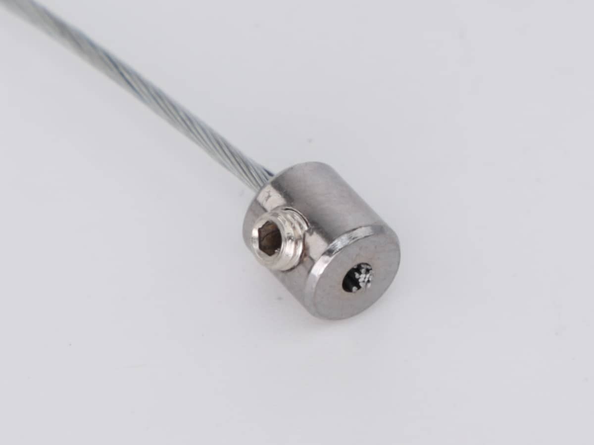Зажим Z211 для троса ∅1.5 мм с зажимным винтом под шестигранник. Диметр зажима 5,7 мм длина 6 мм, внутренний диаметр под трос — 1,75 мм. Как правило используется в качестве наконечника для фиксации троса внутри тросовых подвесов или крепежей. Может быть использован и в качестве регулируемого зажима на тросе в любой его части.