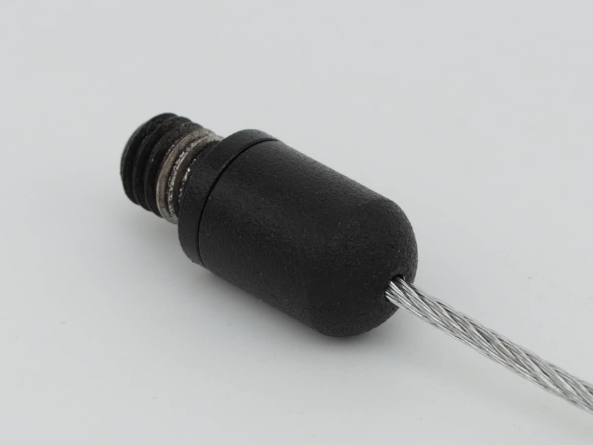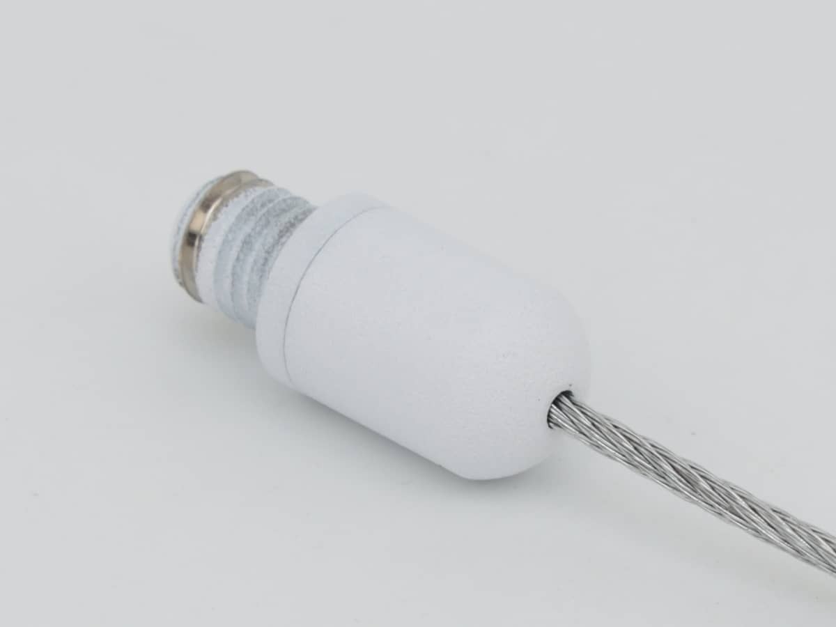 Подвес А293 двухсоставной — цилиндрический колпачок со скруглением на конце и отверстием под трос до 2 мм и основание с резьбой М4 или М6 в две стороны у товара с кодом А293М4 и М8 у товара с кодом A293M8.