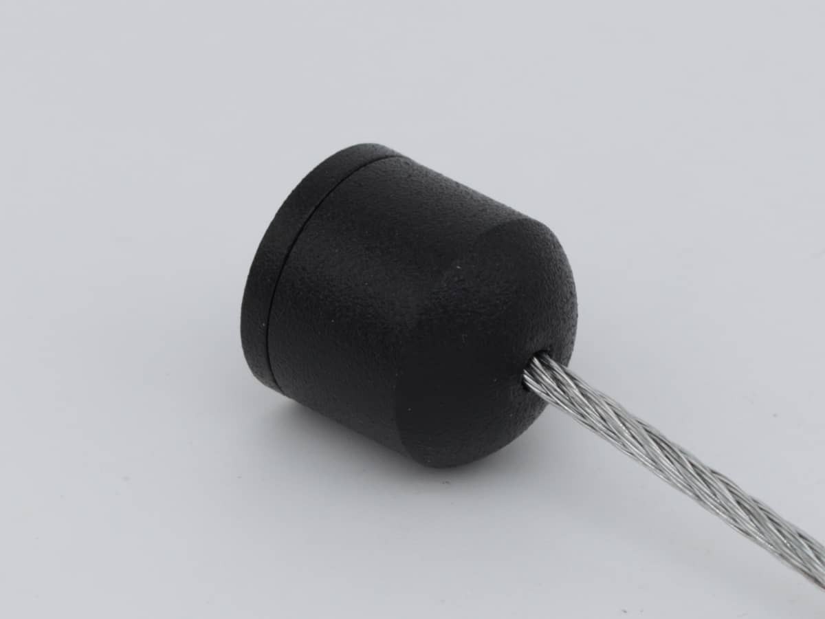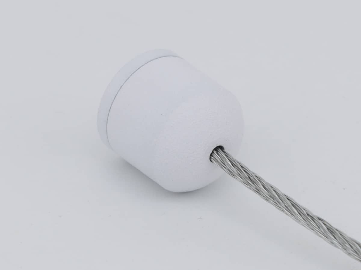 Подвес состоит из двух частей: основание в форме цилиндра с юбкой, на которую накручивается сферической формы декоративный колпачок с отверстием под трос (для троса до 2 мм) и отверстия с резьбой М5 в основании для крепежа подвеса к материалу.