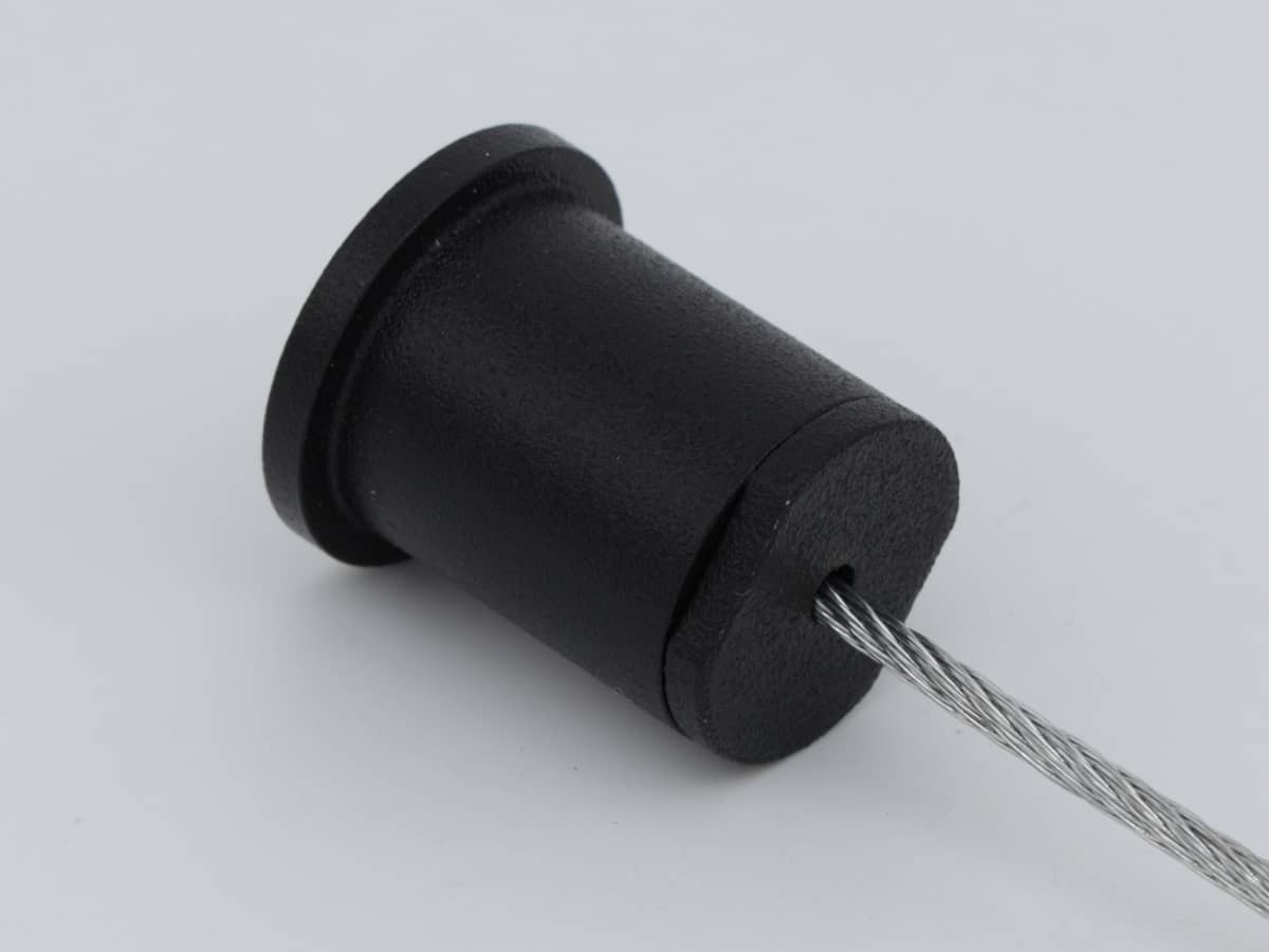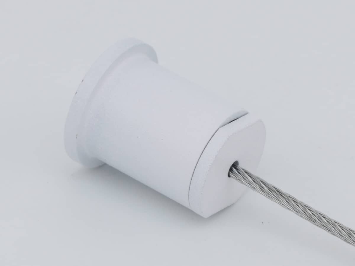 Подвес цилиндрической формы состоит из двух вкручиваемых друг в друга частей: основание в виде цилиндра с резьбой, в которую вкручивается декоративная шляпка с отверстием под трос (диаметр отверстия 2,9 мм). С двух сторон вкручиваемой шляпки имеется шлицы для затягивания колпачка рожковым ключом, что позволяет использовать данный подвес в тех случаях, где необходимо сделать небольшое натяжение троса. Для крепления подвеса к стене либо материалу, в основании цилиндра есть резьба М6 (шаг резьбы 1).
