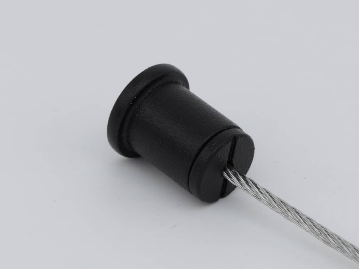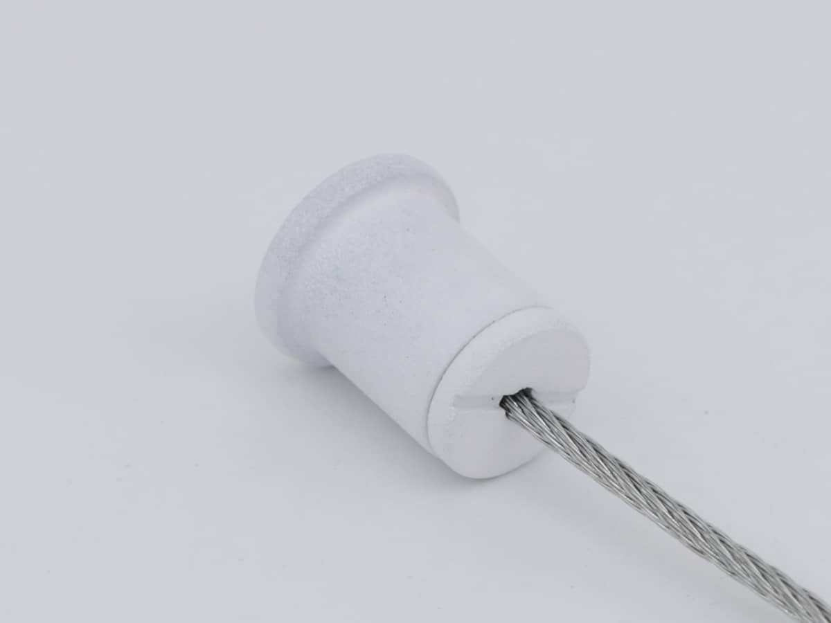 Подвес цилиндрической формы состоит из двух вкручиваемых друг в друга частей: основание в виде цилиндра с отверстием, в которую вкручивается декоративная шляпка с отверстием под трос (диаметр отверстия 2,4 мм). Для крепления подвеса к стене либо материалу, в основании цилиндра есть отверстие диаметром 4,8 мм.
