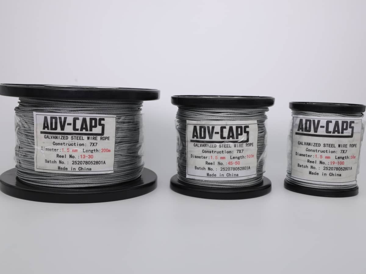 Трос WRGS из оцинкованной стали ∅1.5 мм, средней жесткости, плетение троса 7x7. Трос используется для производства подвесов для светильников, акустических потолков, а так же в рекламе.