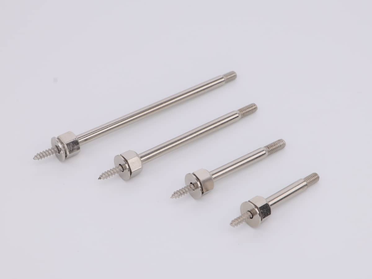 Дистанционный держатель скрытого крепления серии СК400, никелированная сталь сталь. Диаметр дистанционного держателя 5 мм, отступы — 30, 40, 60 и 80 мм.