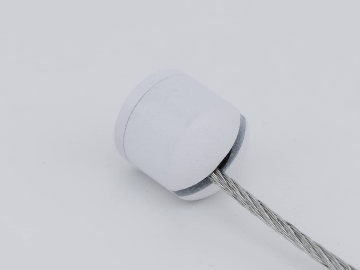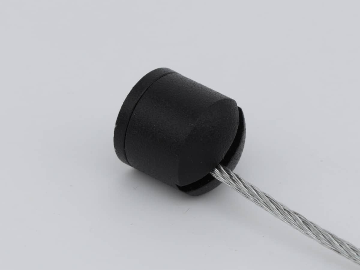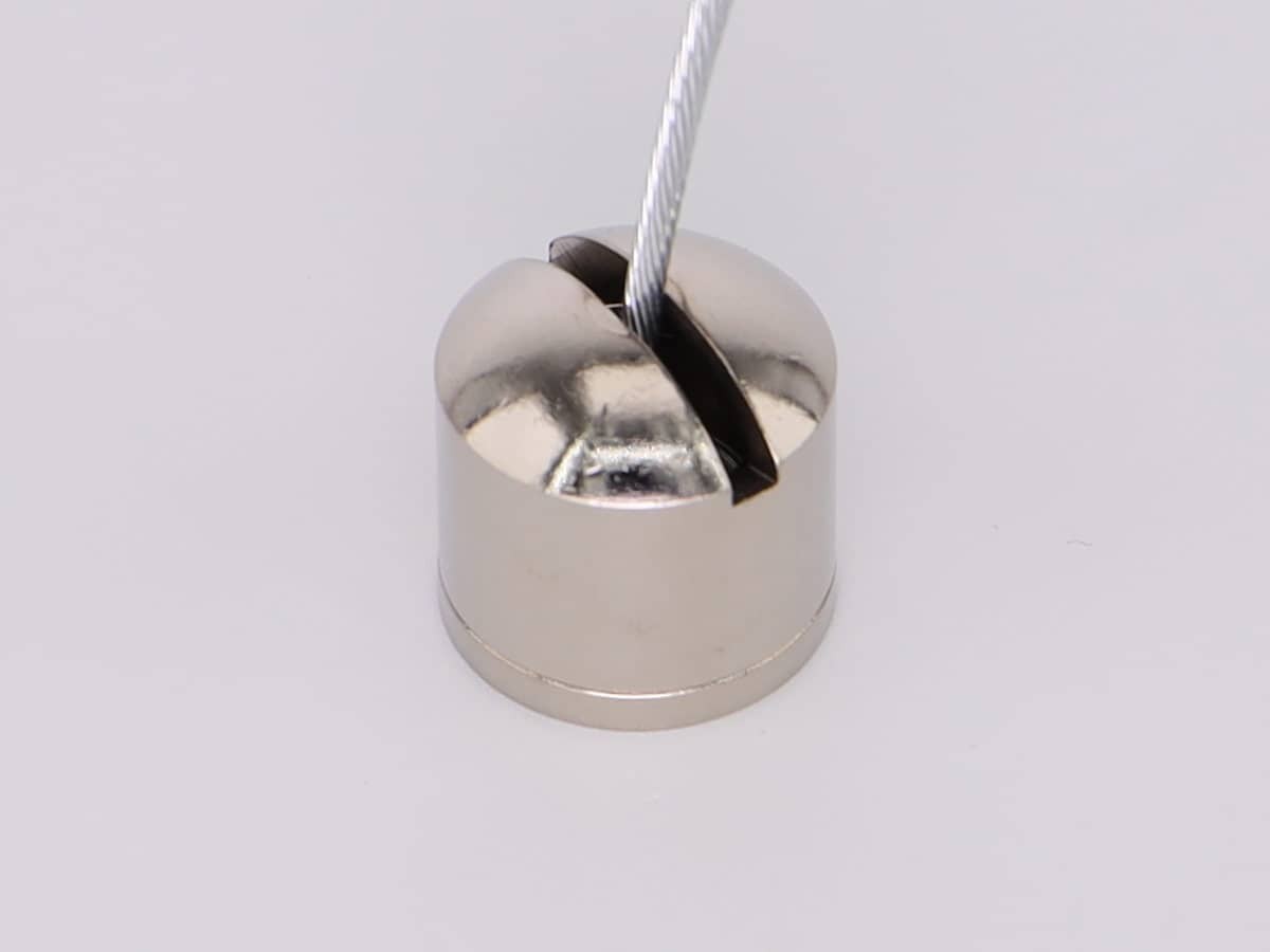 Подвес состоит из двух частей: основание с наружной резьбой на которую накручивается цилиндрической формы декоративный колпачок с прорезью под трос (толщина прорези 2 мм) и внутренней крепежной резьбой M5 (шаг резьбы 0,8) для крепежа подвеса к материалу.